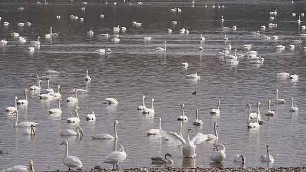 第四站天鹅湖,这里是三门峡的知名景点,8000多亩湿地良好的生态环境,吸引着数万只白天鹅每年来这里栖息越冬,三门峡市也因此被誉为“天鹅之城”。