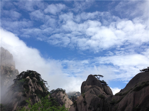 登上光明顶,路过天海,穿过鳌鱼洞,越过莲花峰,再到迎客松。在迎客松看到对面的“天都峰”高耸如云,台阶非常陡,于是手脚并用的往上爬。每爬完一段山路,抬头望去眼前都是让人惊喜的风景。傍晚回到南屏,只有星星,还在满空地乱跑,像是顽皮的孩子,我们这一天已非常疲惫,爬到床上刚聊不到几句,就都甜甜地进入梦乡了。