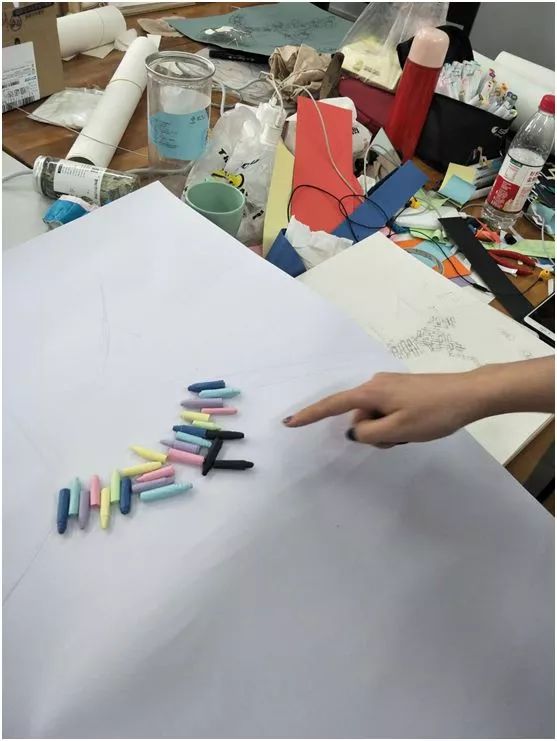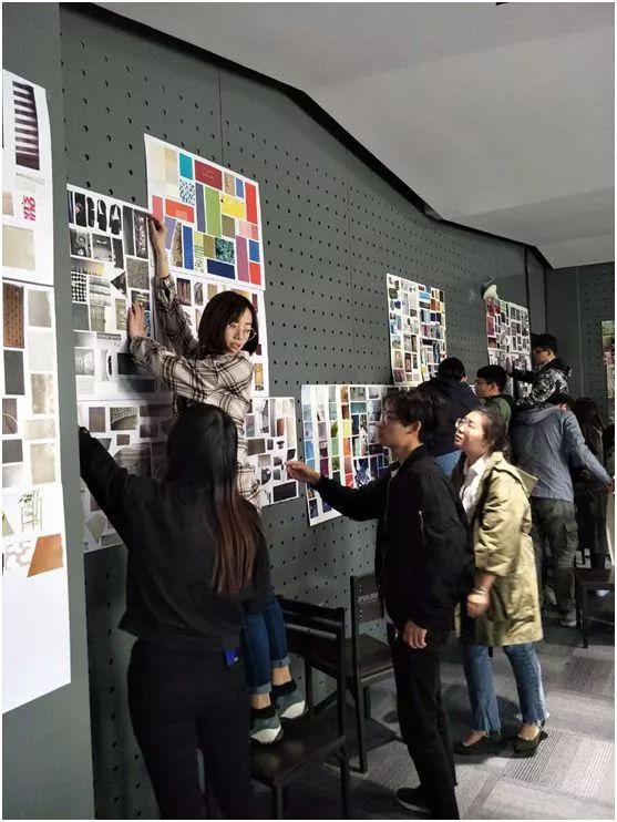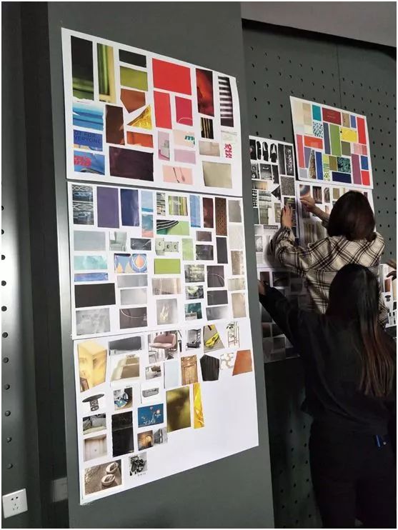 产品一班的课堂上,玛利亚老师让同学们提前把做好的资料板贴在墙壁上,根据个人产品需要把不同质地的材料、不同感觉的颜色,有秩序地排列在上面。以此让他们清楚直观的排布方式更有利于比较各种优劣点,做出最适合自己设计产品需要的选择。