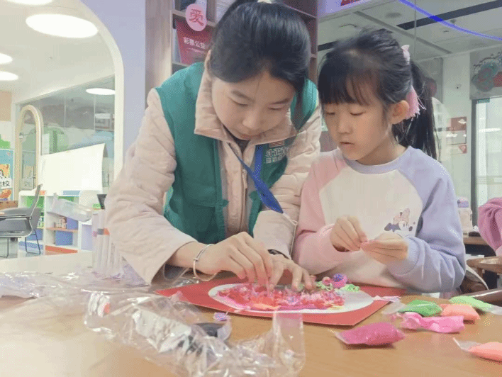 孩子们全神贯注地跟着志愿者的教学,遇到困难时,志愿者总是第一时间察觉到孩子们的困扰,他们会温柔地俯下身,轻轻拍拍他们的肩膀,用鼓励的眼神注视着他们,手把手地教他们如何把黏土捏得更精致。志愿者温暖的大手包裹着小朋友稚嫩的小手,传递着无尽的力量与信心。