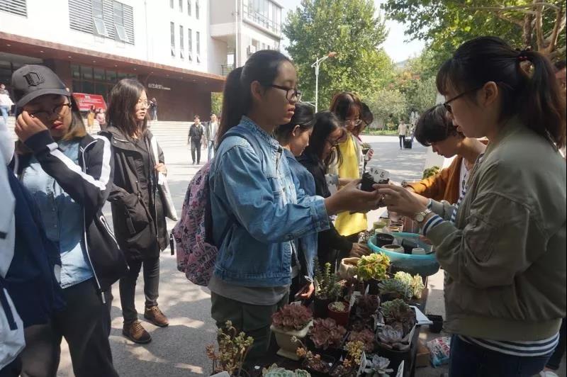 本次市集上,耳坠项链等小饰品颇受女孩子们青睐,价格实惠且做工精美是吸引她们的主要原因;多肉植物也是极受欢迎的,携带轻便且不占空间,呆萌青翠布局精巧,让人赏心悦目,成为了师生宠爱的对象。