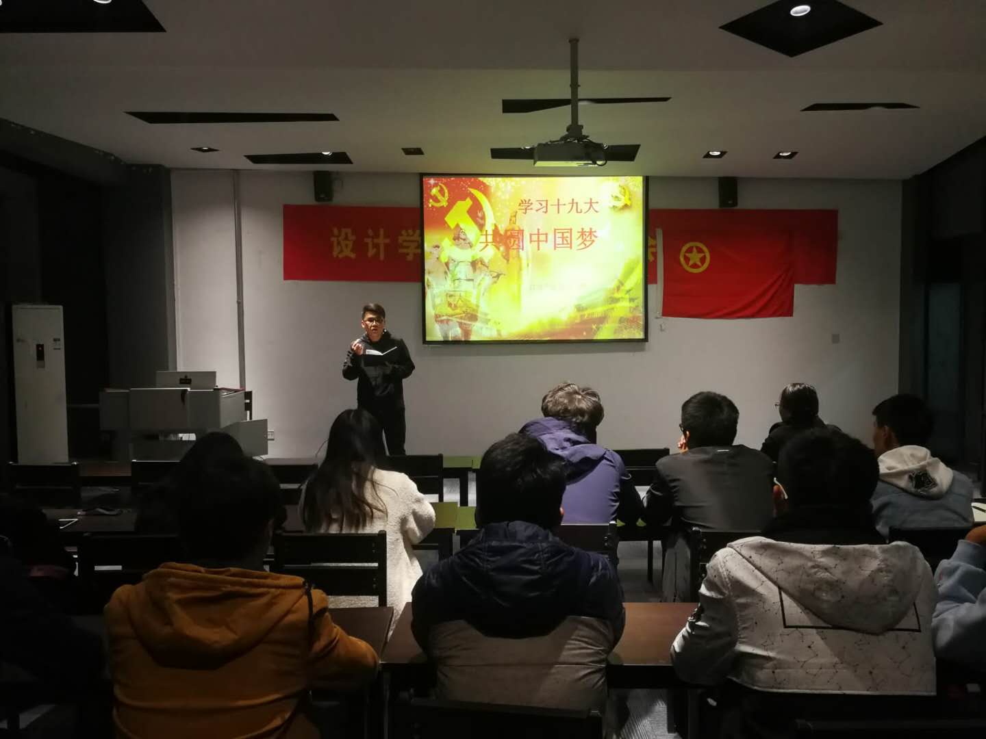 2017年11月,设计学院各年级团支部陆续开展了“学习十九大·共圆中国梦”主题团日活动。本活动旨在深入学习贯彻党的十九大精神,用十九大精神指导我们的工作、学习和生活,引领广大团员青年坚定理想信念,志存高远,脚踏实地,在实现中国梦的生动实践中,放飞青春梦想。