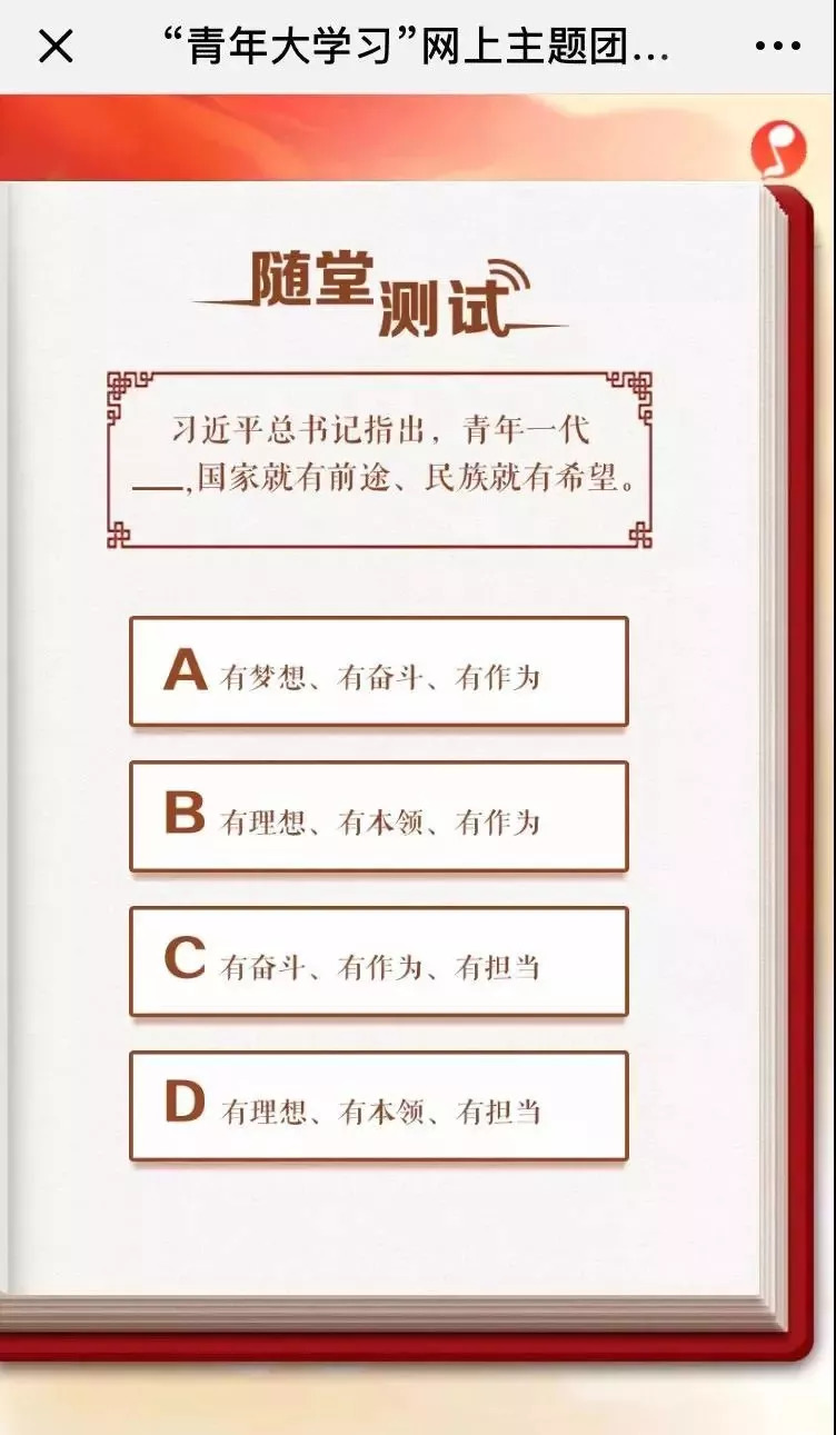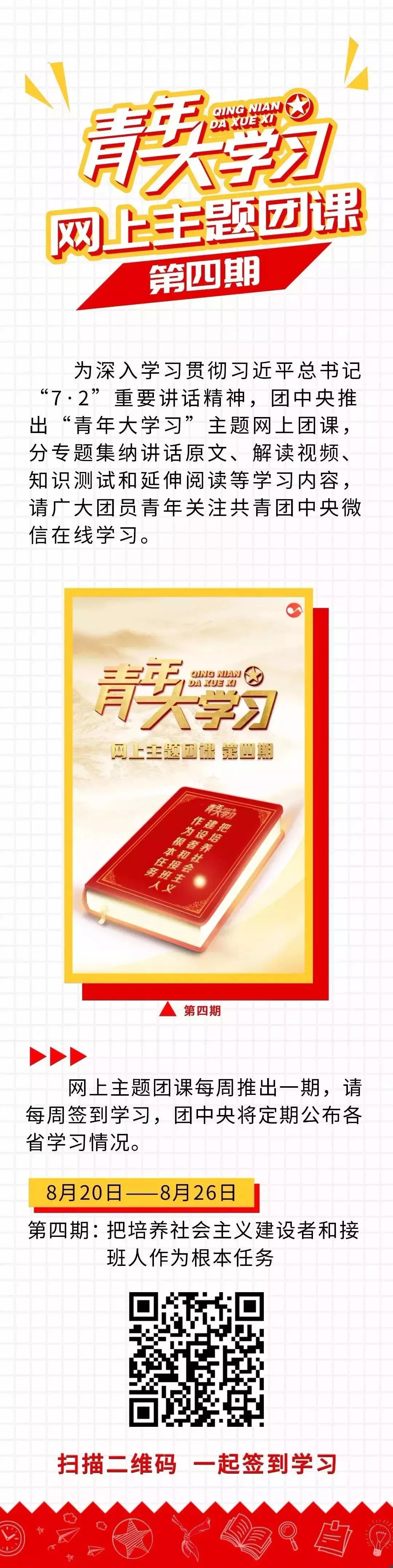 据悉,“青年大学习”网上主题团课将持续推进,将以每周一期的频率推出。届时,团中央还将对各地团员学习的情况进行考评并公布。到目前为止我们“青年大学习”主题团课已经进行第四期啦!