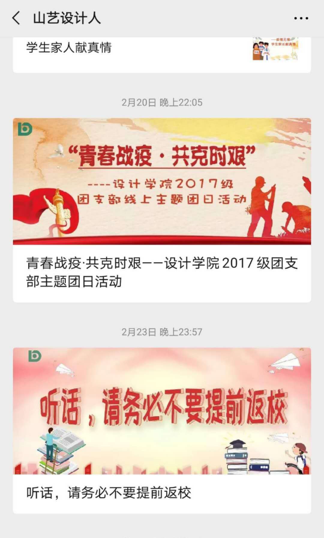 在整个疫情防控期间,设计学院团总支辅导员老师坚持日报告零报告,做好学生健康备案。他们每天都要通过多种途径及时了解掌握1538名学生的个人位置及身体状况,随时待命询问、登记、上报。对湖北籍学生和有武汉进出经历或接触过疫情发生后从武汉离开人员的学生,随时关注他们的健康情况。随着疫情的发展,辅导员老师及时关注疫情期间学生的心理健康、毕业生就业和家庭经济困难学生的生活情况,传递学校的温暖,使同学们统一思想、共克时艰、凝心聚力,坚定战胜疫情的信心。