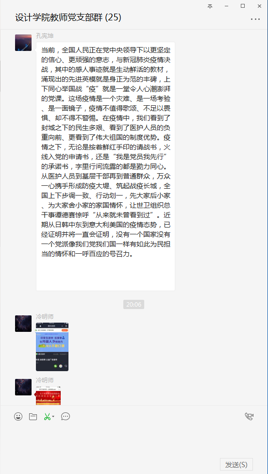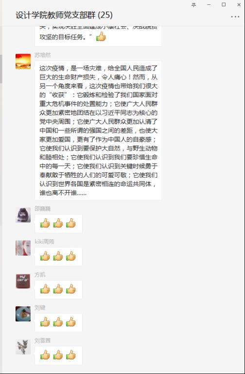 设计学院党总支书记孔宪坤认为:“当前,全国人民正在党中央领导下以更坚定的信心、更顽强的意志,与新冠肺炎疫情决战,其中的感人事迹就是生动鲜活的教材,涌现出的先进英模就是身正为范的丰碑,上下同心举国战“疫”就是一堂令人心潮澎湃的党课。这场疫情是一个灾难、是一场考验、是一面镜子,疫情不值得歌颂、不足以畏惧、却不得不警惕。在疫情中,我们看到了封城之下的民生多艰、看到了医护人员的负重向前、更看到了伟大祖国的制度优势。疫情之下,无论是按着鲜红手印的请战书,火线入党的申请书,还是“我是党员我先行”的承诺书,字里行间流露的都是勠力同心。从医护人员到基层干部再到普通群众,万众一心携手形成防疫大堤、筑起战疫长城,全国上下步调一致、行动划一,先大家后小家、为大家舍小家的家国情怀,让世卫组织总干事谭德赛惊呼“从来就未曾看到过”。近期从日韩中东到意大利美国的疫情态势,已经证明并将一直会证明,没有一个国家没有一个党派像我们党我们国一样有如此为民担当的情怀和一呼百应的号召力。”