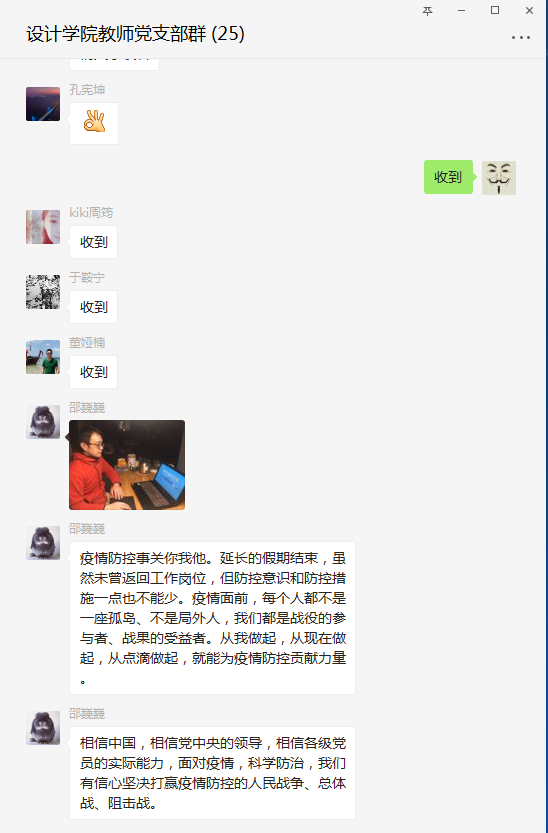 设计学院党总支副书记苏培然提到:“高度重视、理性对待、积极配合、科学防护、乐观面对,做表率、做贡献、不添乱,我想这是每一名共产党员在抗击疫情特殊时期应该做到的。”