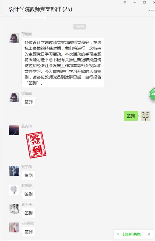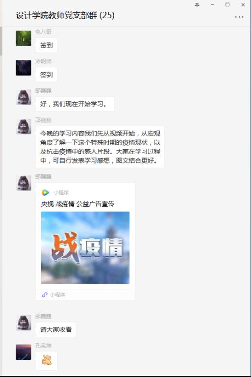 2020年3月9日晚,设计学院教师党支部开展“线上战疫”主题党日活动。教师党支部25名党员参加,活动由党支部书记邵巍巍主持。