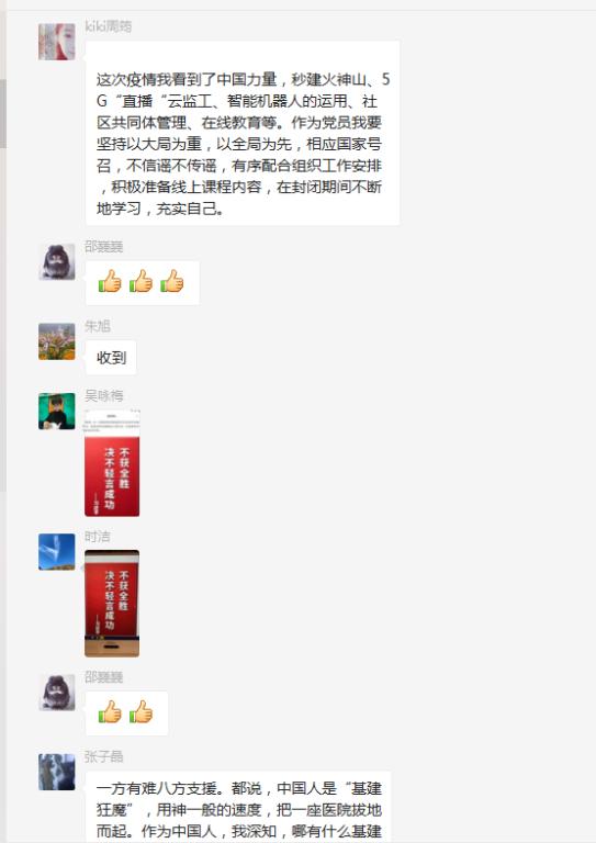 党支部委员周筠表达了隔离期间的工作心态和学习动力:“暂时的隔离是为了长久的相聚,局部的封闭是为了更大范围的安全。作为党员应该同心同德、共克时艰,相信在党中央的坚强领导下,不忘初心、牢记使命,全面贯彻坚定信心、同舟共济、科学防治、精准施策的要求,紧紧依靠人民群众,坚持全国一盘棋,胜利的春天必将会到来。”