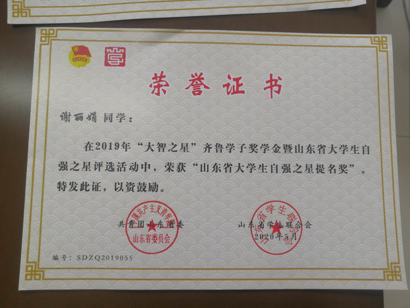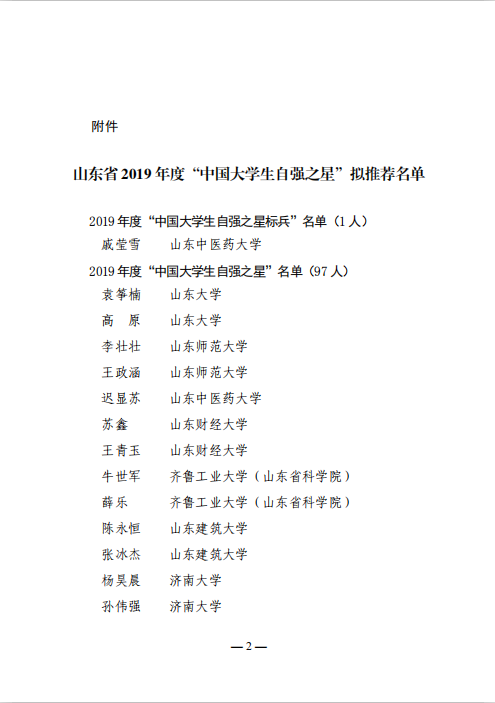 “中国大学生自强之星”奖学金拟推荐人选从 2019 年“大智之星”齐鲁学子奖学金暨“山东省大学生自强之星”获奖名单中推选产生。经省级评审,现将山东省 2019 年度“中国大学生自强之星标兵”“中国大学生自强之星”奖学金拟推荐人选予以公示。
