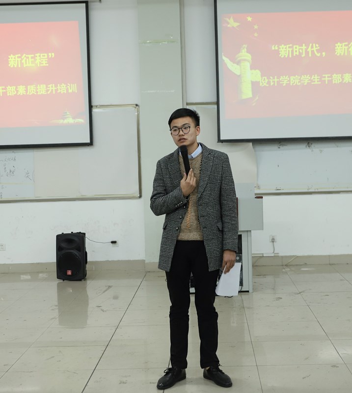 为了深入贯彻落实党的十九大精神,提升学生干部的思想理论素质。11月16号晚六点,设计学院学生干部素质提升培训最后一课,在设计学院A楼C301顺利举行。本次课程由学生会主席徐嘉泽主讲,设计学院学生会全体成员及2017级各班班委到场聆听。
