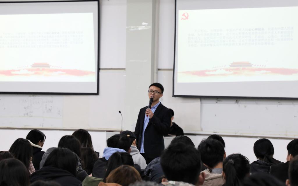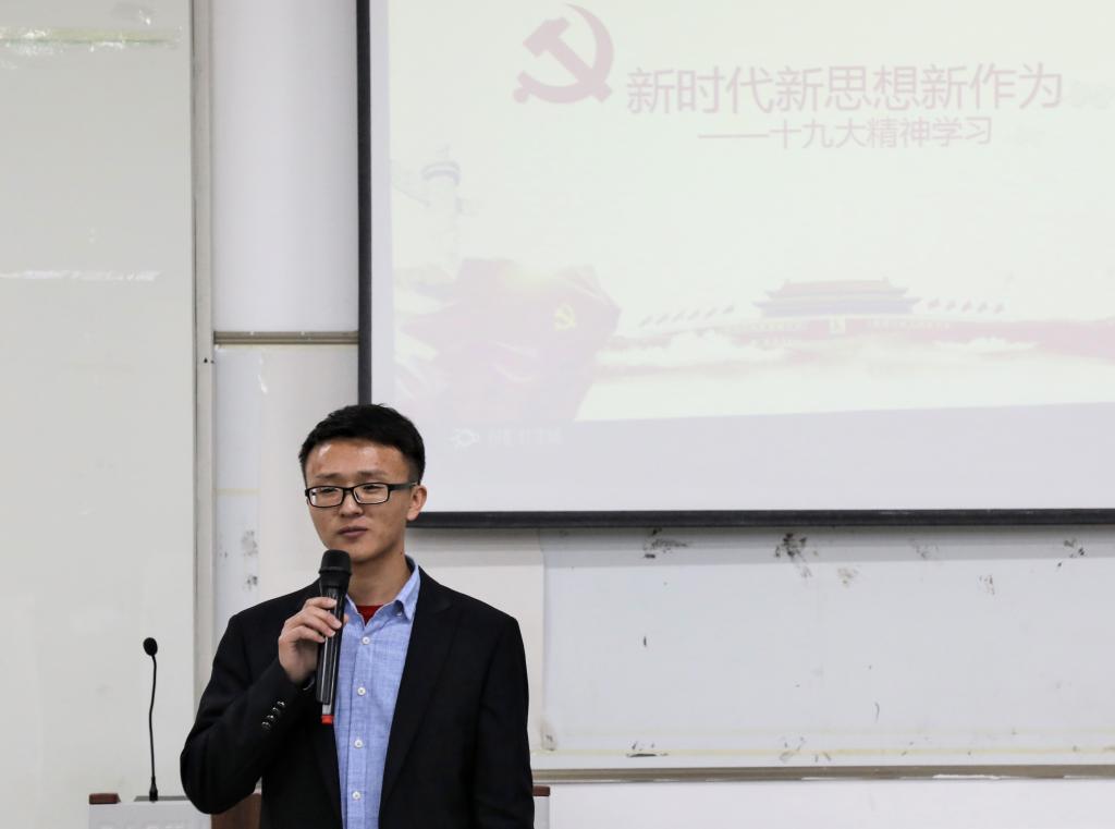 其次,李老师介绍了党的十九大的概况,强调了 “不忘初心、牢记使命,高举中国特色社会主义伟大旗帜,决胜全面建成小康社会,夺取新时代中国特色社会主义伟大胜利,为实现中华民族伟大复兴的中国梦不懈奋斗”这一伟大主题。并从十九大的意义中引伸出学生干部的使命和初心就是为同学们服务,让山东艺术学院变得更加辉煌。