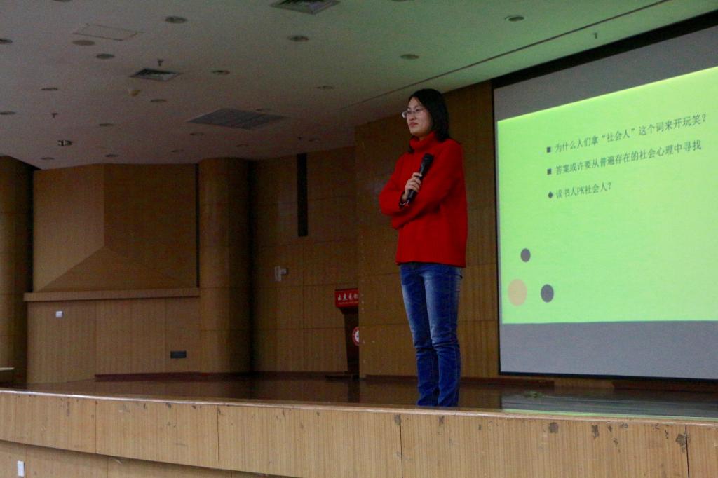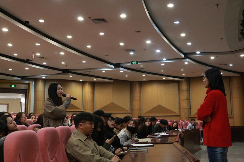首先,回老师在“网络文明”方面与学生进行交流互动,带领学生解读网络流行语,赋予文明新内涵。她列举了近几年来的网络流行语,反映出当代青年的社会生活状况,以“社会人”为例,从社会心理角度分析了“读书人”与“社会人”之间的区别:“读书人”即学生普遍渴望成熟,渴望成为独立的个体,而社会人往往想要回归简单与真诚。