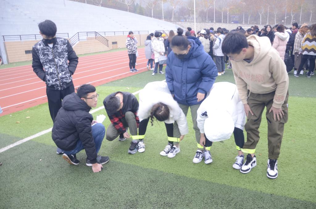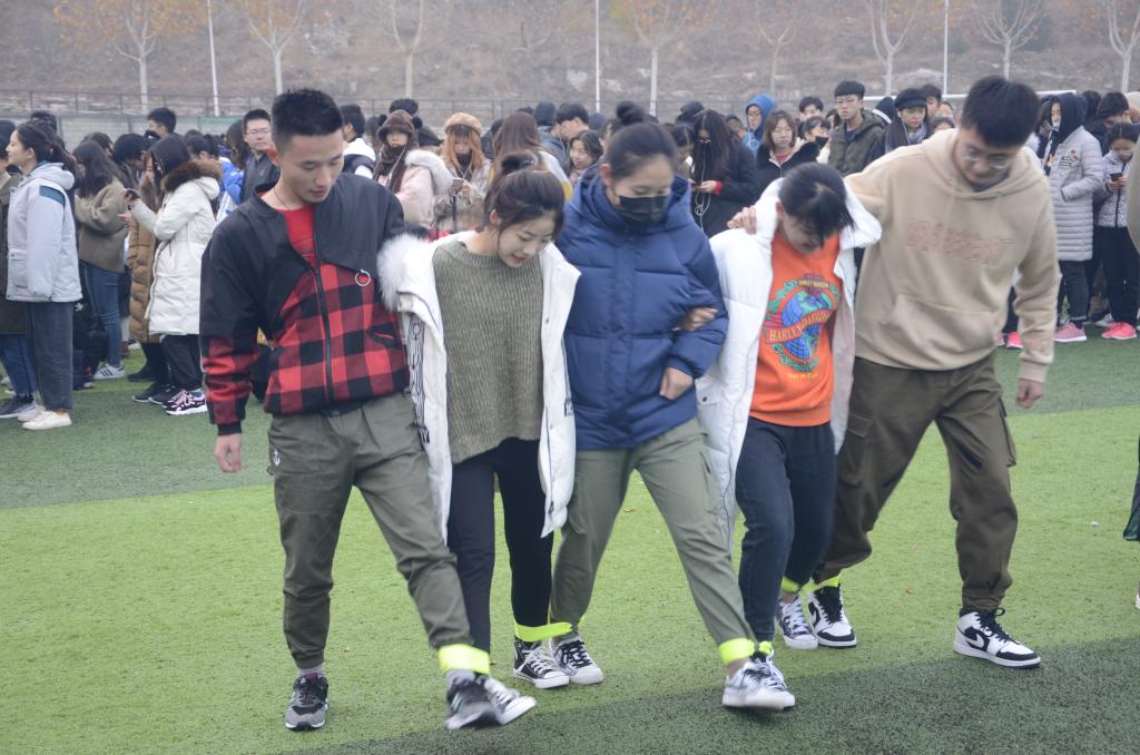 本次活动的项目为“五人六足”。比赛队伍以班级为单位,各班由二个男生三个女生共同参与,每五人为一组。赛前每组同学各一条腿用布带捆缚在一起(捆在踝关节以上和小腿靠近膝关节部位,捆牢),站立方式起跑。三组比赛小分队同时行动,以脚绑脚的形式集体前进,以最短时间到达终点队伍获胜。