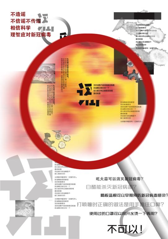 设计说明: 面对疫情,公众对各种信息高度敏感,不仅是对此次疫情的高度重视,更是出于对同胞的关怀。而有一些人却利用这个机会趁虚而入,散布谣言,扰乱人心。面对疫情面前的众多信息我们要理性对待、保持冷静、仔细鉴别,做到不造谣,不信谣,不传谣。