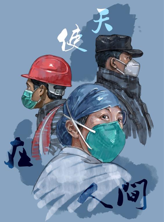 设计说明:世上没有从天而降的天使,只有挺身而出的凡人。疫情当前,在医护人员、建筑工人和警察这些职业上平凡人挺身而出,可谓人间的天使。