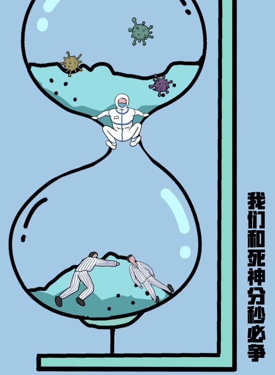 设计说明:战疫医护人员用身体挡住时间的沙漏,分秒必争阻止沙子侵害病人,也代表医护人员努力挡在病毒和患者之间。