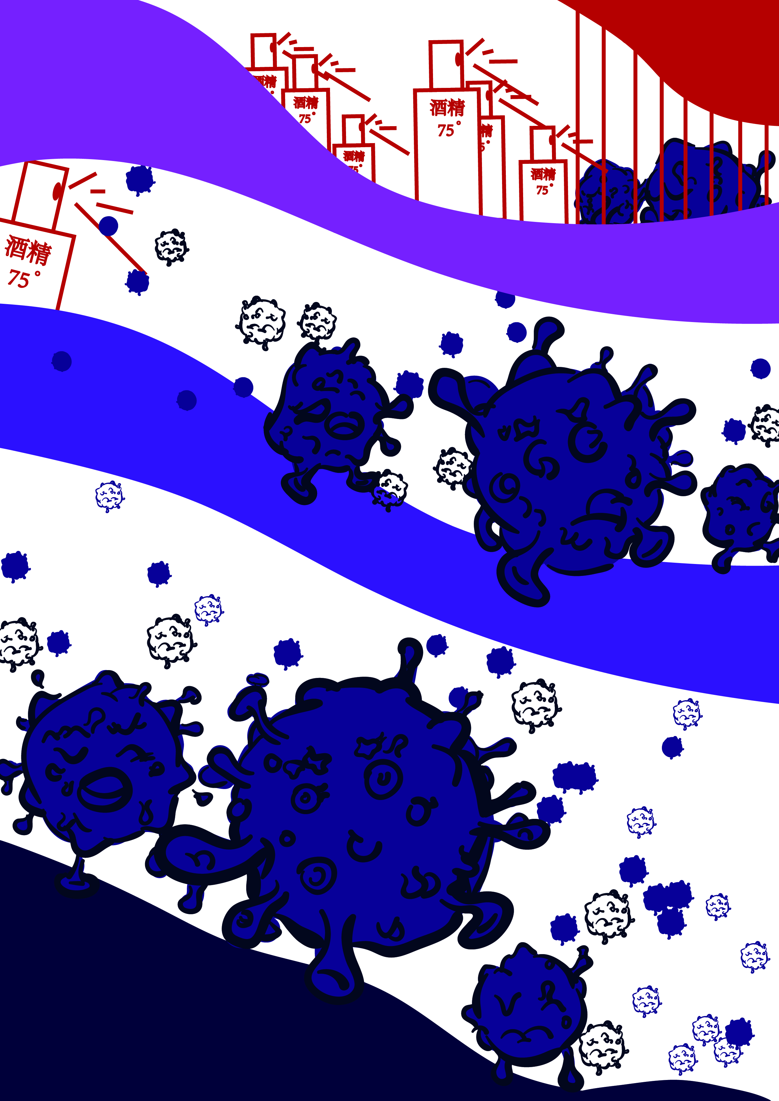 设计说明:由下至上:病毒的诞生、逃跑和消亡。蓝紫色代表病毒,红色代表美好,由左下至右上,由黑暗至美好,要相信美好的明天就要来到。