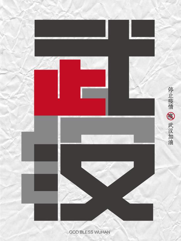 设计说明:通过对武汉两个字进行加工改造,融入新的元素,拆取其部分加入“止疫”二字,意味能够停止疫情。字体采用工整结实的方块字体,寓意只要团结凝聚,目标和行动一致,我们就能够停止这场疫情。