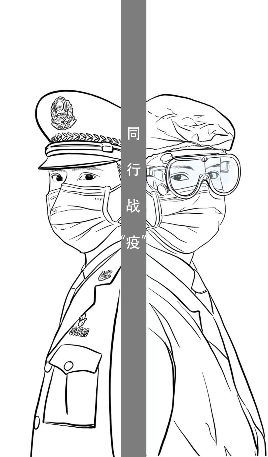 设计说明:战“疫”是持久的,是艰巨的,逆行人在前方挡住了万难,同行战“疫”作品就是把警察和医护人员共同表现,但用一面“墙”来隔开,你负责外、我负责内。不同的岗位同样的任务,你我同行,共同战“疫”。