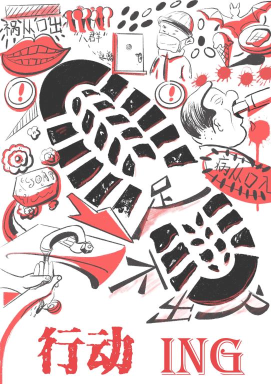 设计说明:我们足不出户,但我们在行动,病从口入,切记不要乱吃!祸从口出,切记不要信谣传谣!远离人员密集场所,勤洗手,我们宅在家,我们在行动!