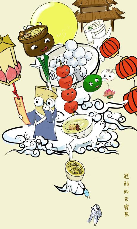 创作感想:元宵节是传统的团圆节日,将武汉化身为热干面的形象,其他地区也化身为美食的形象,在画面中融入了元宵节“猜灯谜”、“吃元宵”的习俗,背景加入了武汉标志建筑“黄鹤楼”,展现出希望疫情过去大团圆的愿望。